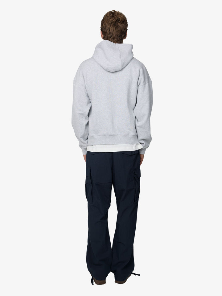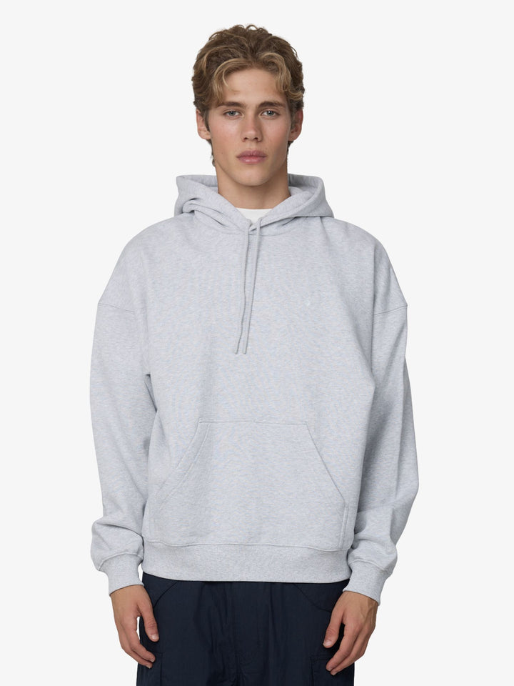 The Article Heart Hoodie by Article One has a boxy shape. Features dropped shoulder seams and a drawstring hood. Includes a small embroidered heart on the chest and ribbed finishes at the hem and sleeves.