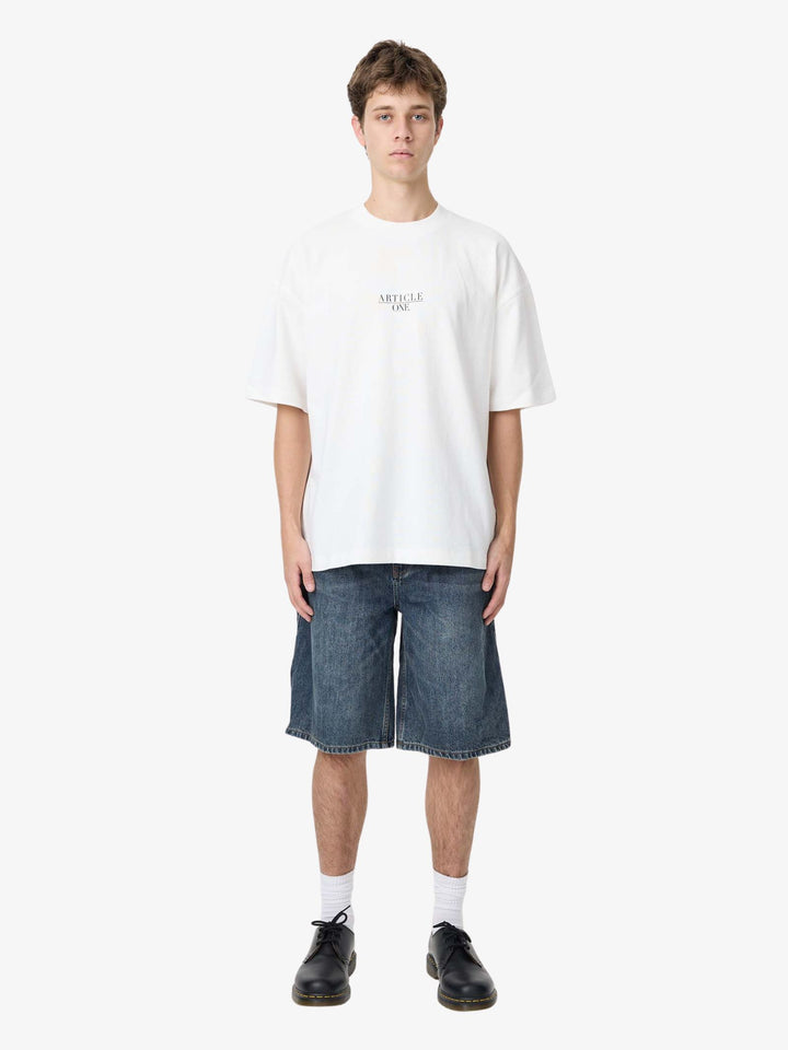The Benji Denim Shorts by Article One are made from mid-weight denim with a loose fit. Designed with belt loops, a button-fly closure, and a five-pocket build, finished with a washed texture.