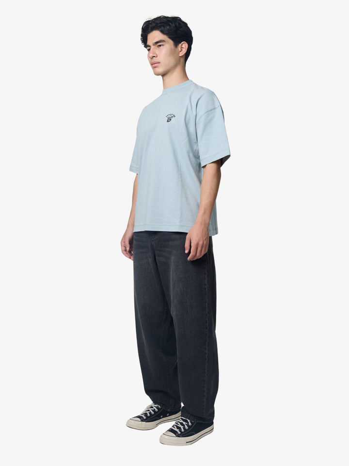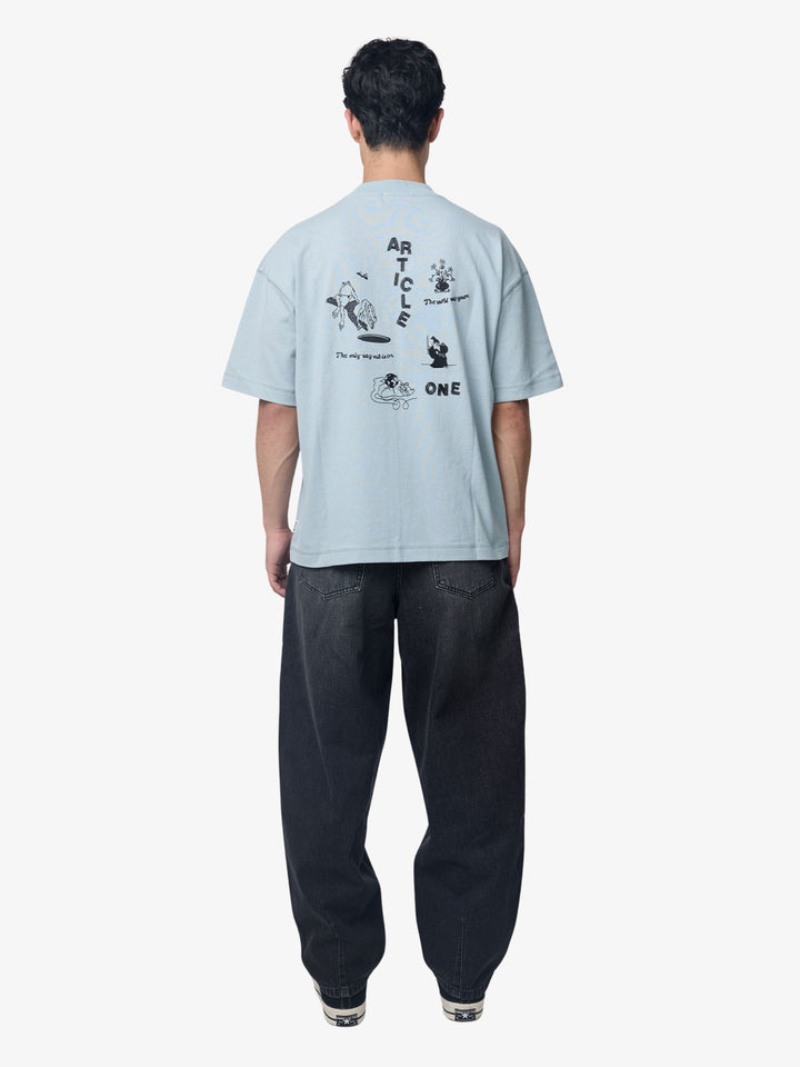 The Black Hole Tee by Article One comes in an oversized, boxy cut. Designed with a ribbed crewneck and dropped shoulder seams, it features a small logo on the chest and multiple graphics printed across the back.