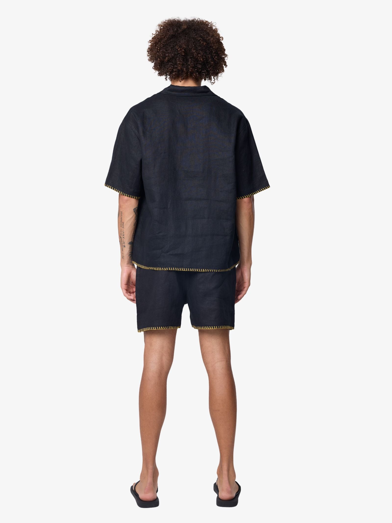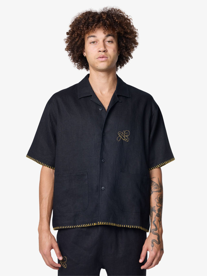 The Goleta Shirt from Article One is cut in a relaxed fit and made from lightweight woven fabric. It features contrast yellow stitching, a chest embroidery, dual front pockets, and a full button closure.