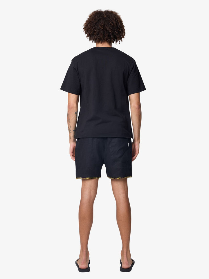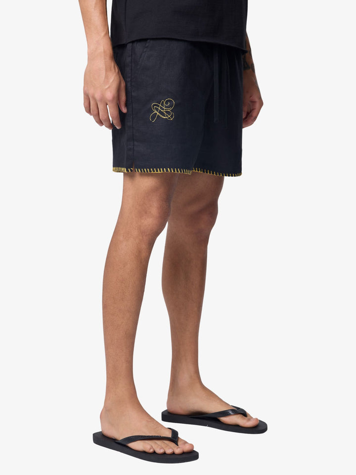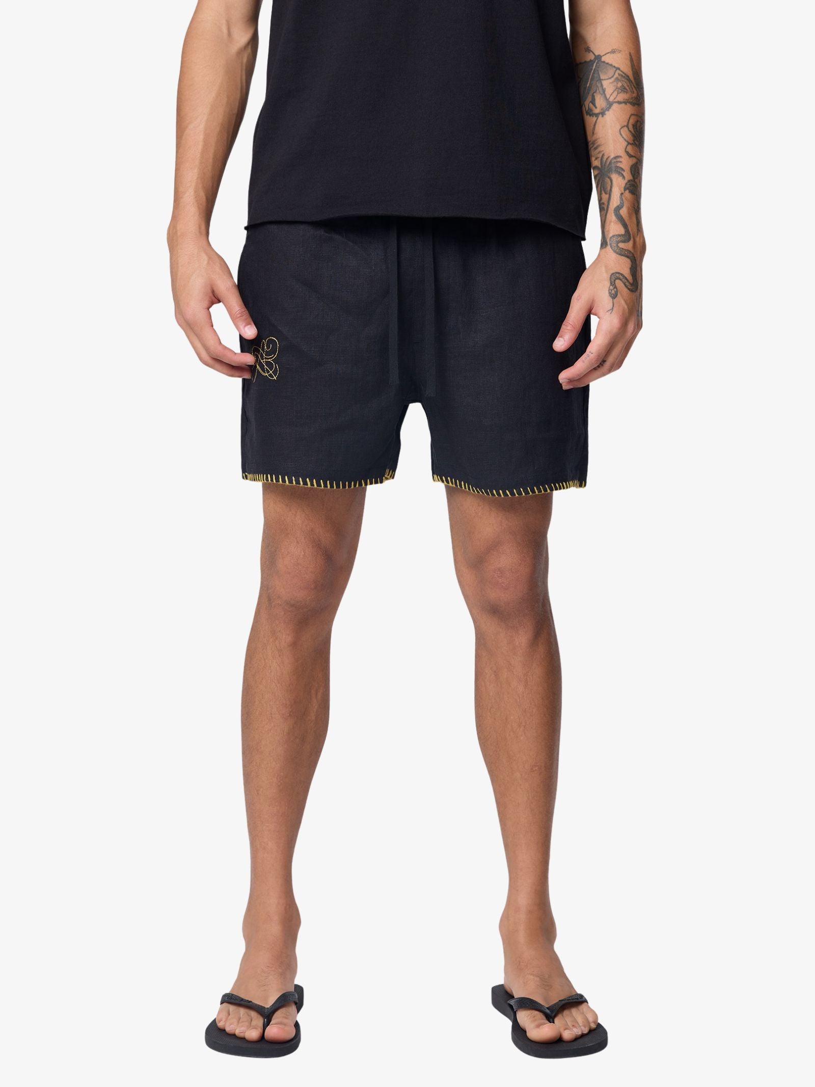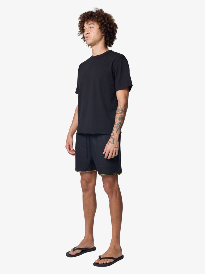 The Goleta Short from Article One are made from lightweight linen fabric in a relaxed fit. They feature an adjustable drawstring waistband, contrast yellow stitching at the hem, and an embroidered logo on the leg.