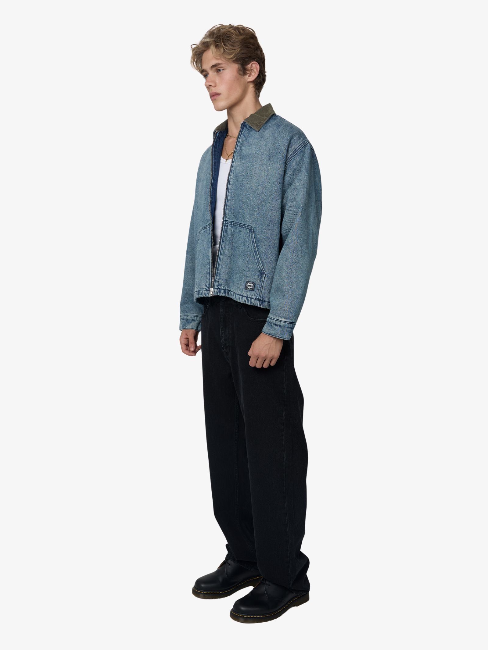 The Henry Jacket by Article One has a boxy shape. Features a washed denim material, a contrast corduroy collar, and a metal zip closure. Includes dual front pockets and buttoned sleeve cuffs.