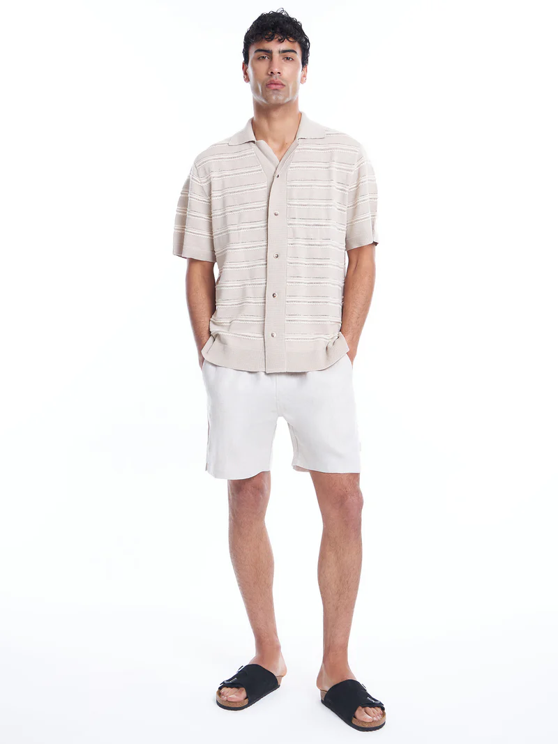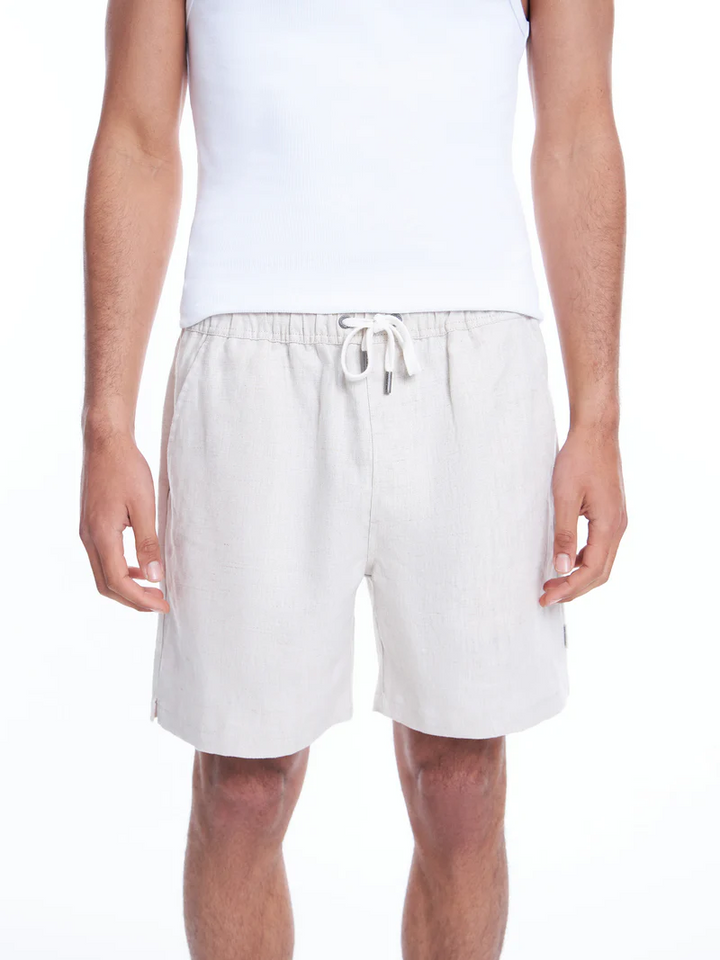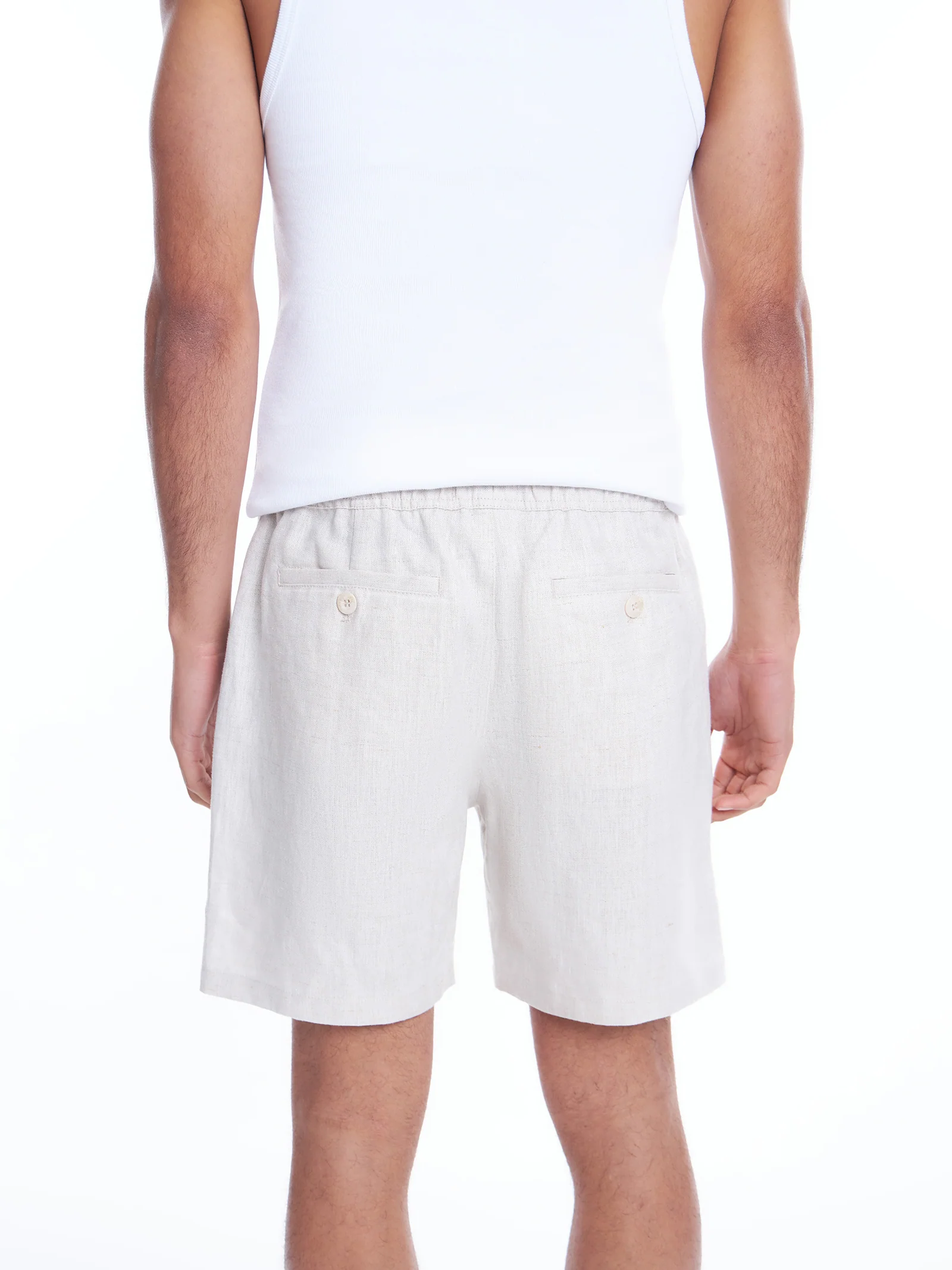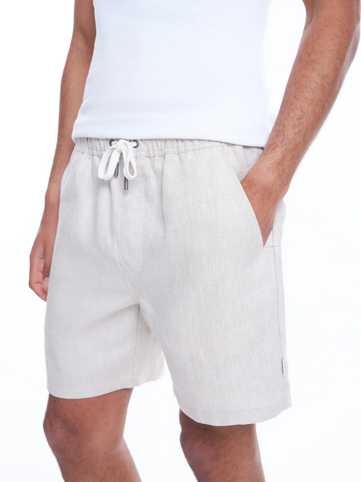 These casual natural shorts are crafted from lightweight, breathable linen with a soft washed finish for all-day comfort. Featuring an elasticised waistband with cotton drawcords and back welt pockets with button closures, they deliver an easy fit with a clean, laid-back look.