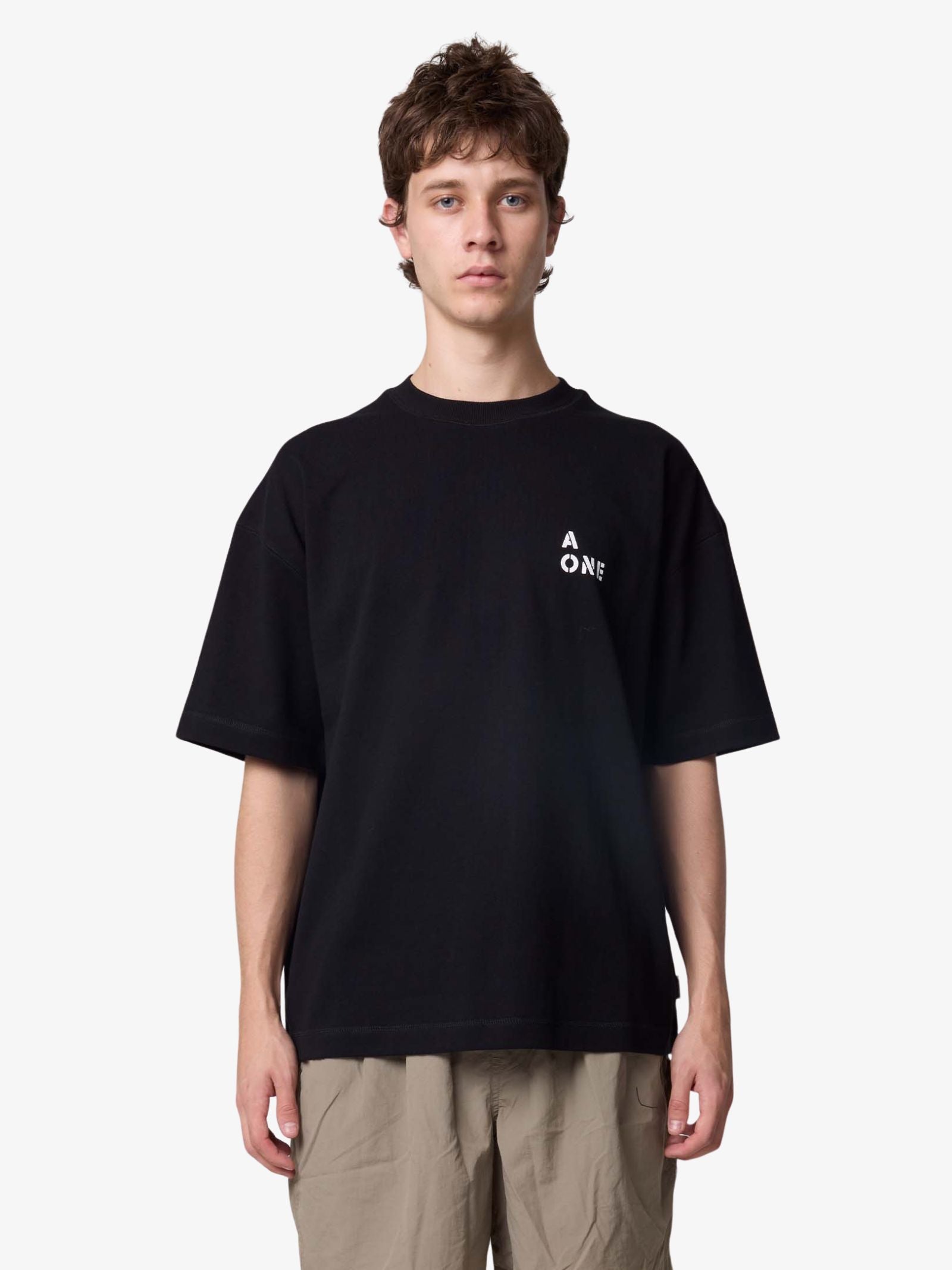The Nowhere Fast Tee by Article One has an oversized, boxy fit with dropped shoulder seams, constructed from a structured heavy cotton fabric. It features a simple crew neckline, a small "A ONE" logo printed on the chest, and a large subway graphic on the back.