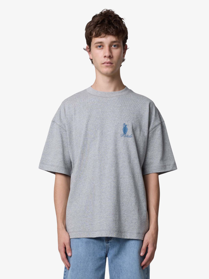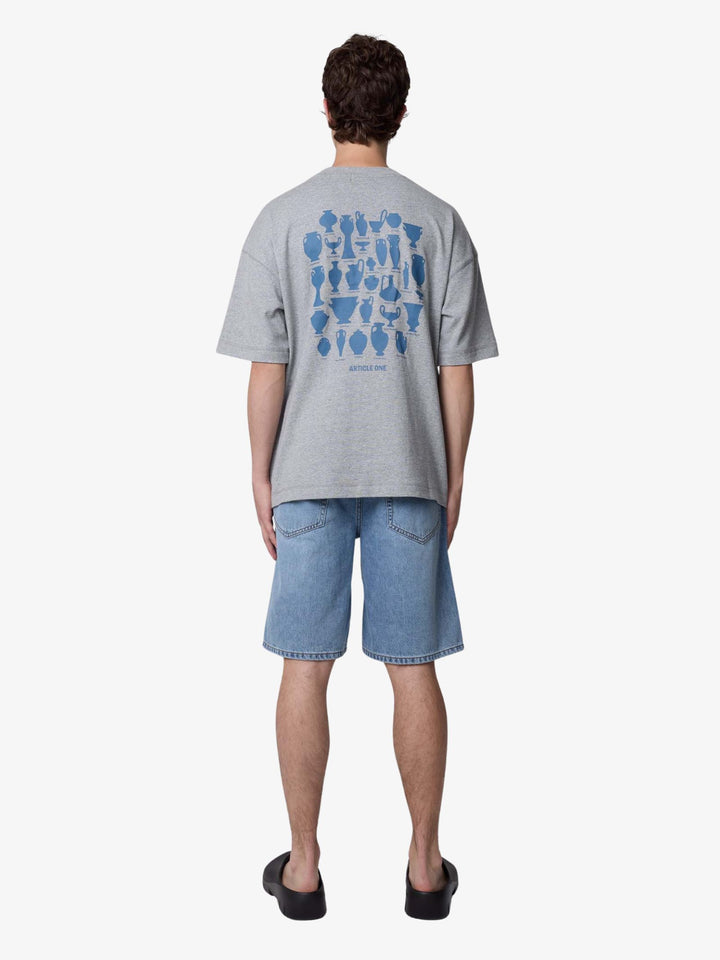 The Pottery Tee by Article One has a boxy fit with dropped shoulder seams, constructed from a soft, heathered cotton component. It features a ribbed crew neckline, a small blue vase print on the chest, and a large grid of labeled ancient Greek vessels on the back.