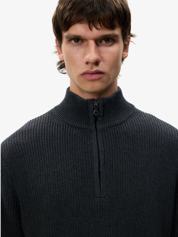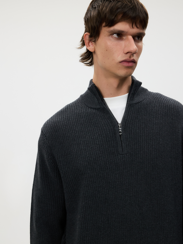 The Rib Quarter Zip Sweater in Charcoal has a relaxed fit with a soft ribbed texture.