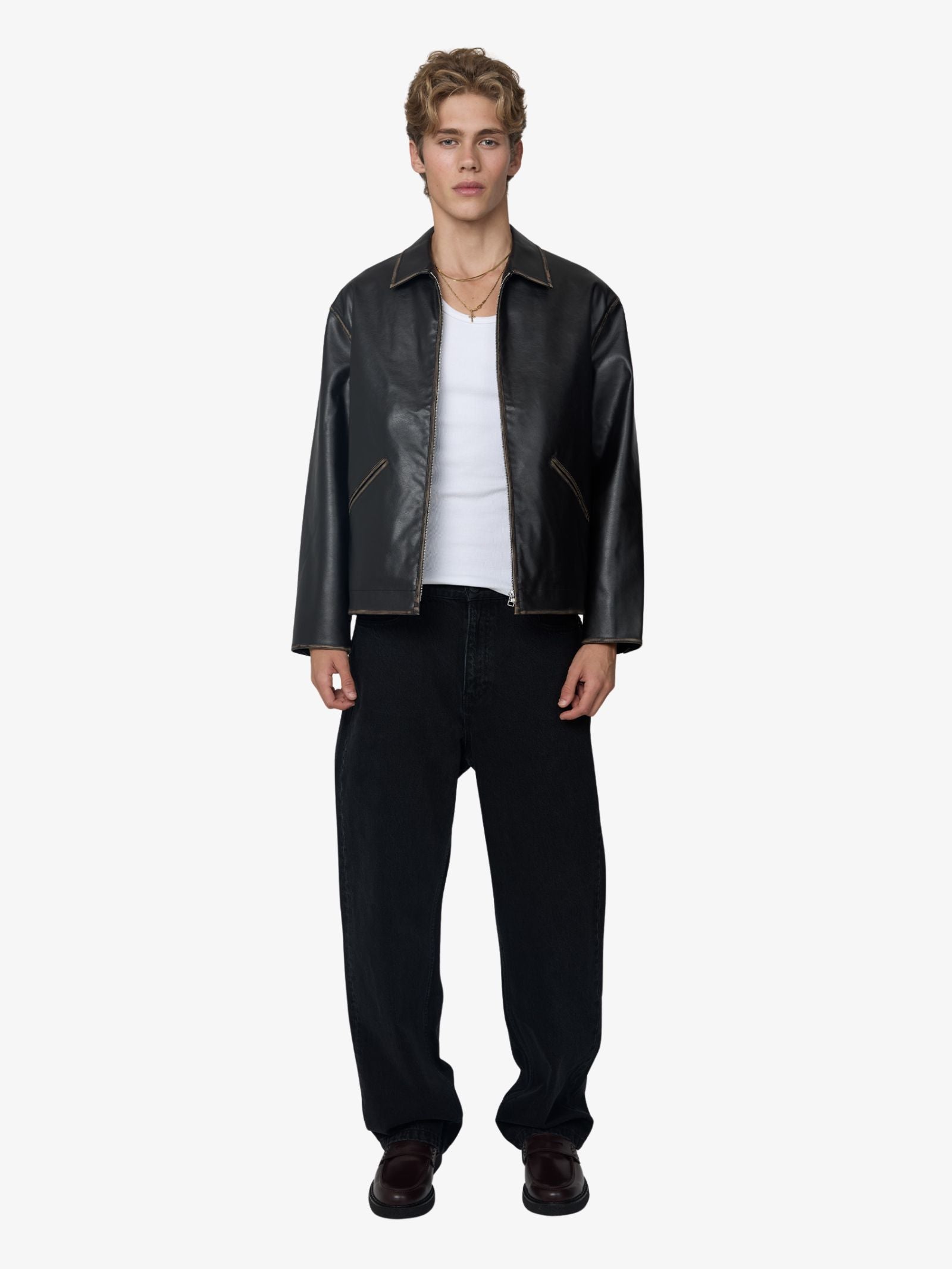 The Rick Jacket by Article One has a boxy shape. Features a distressed black leather-look material, a standard metal zipper, and lowered shoulder seams. Includes functional side pockets and buttoned sleeve cuffs.