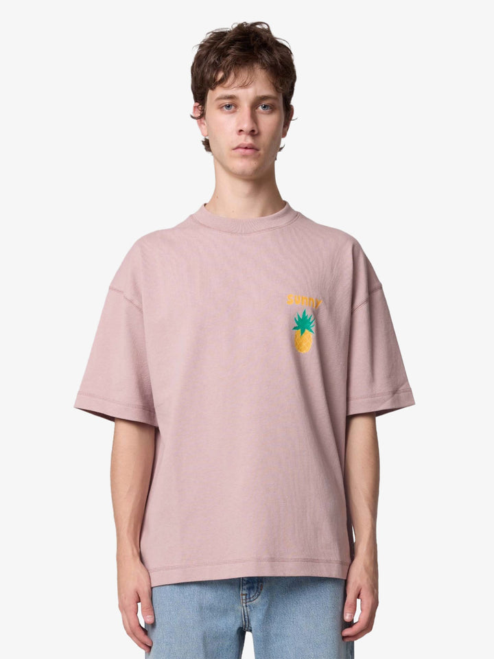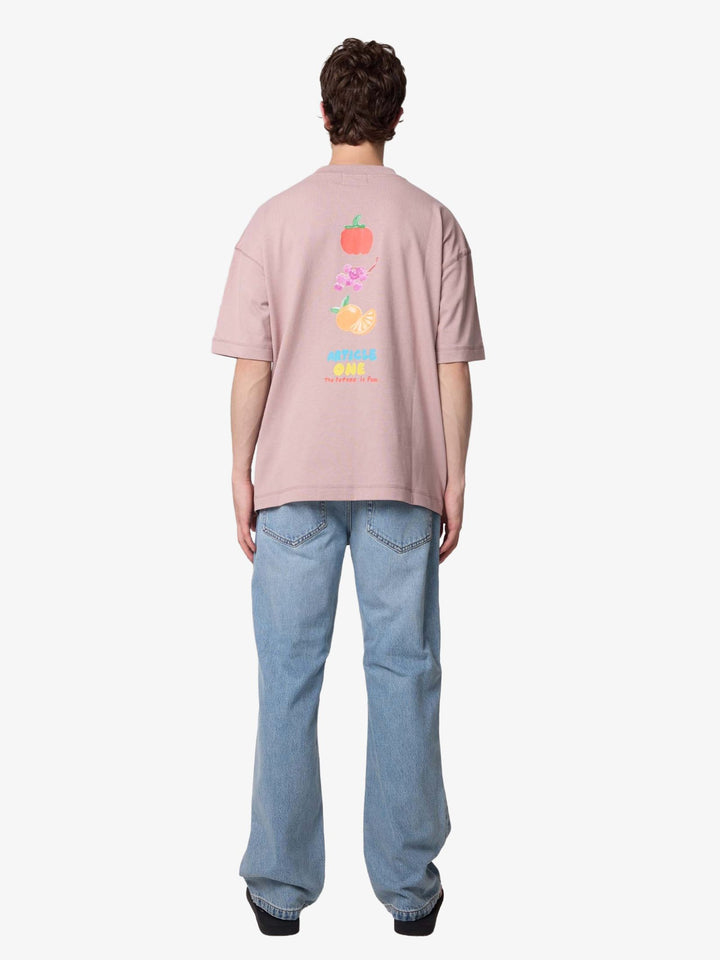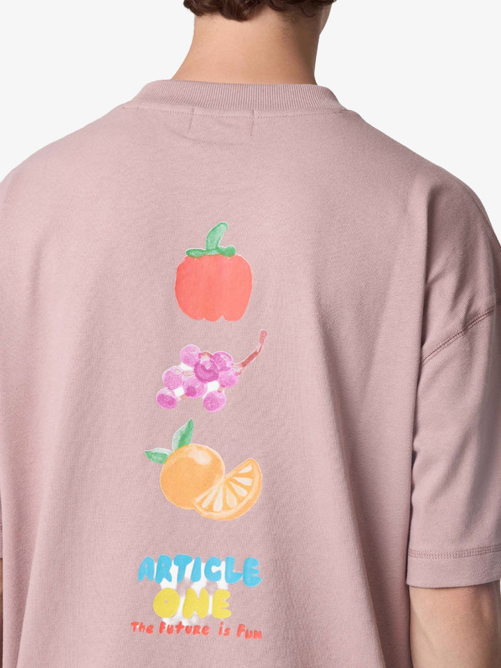 The Salad Tee by Article One comes in a boxy cut with dropped shoulder seams, constructed from a soft cotton jersey component. The design features a chest print reading "Sunny" next to a pineapple, and a tiered fruit graphic printed on the rear.