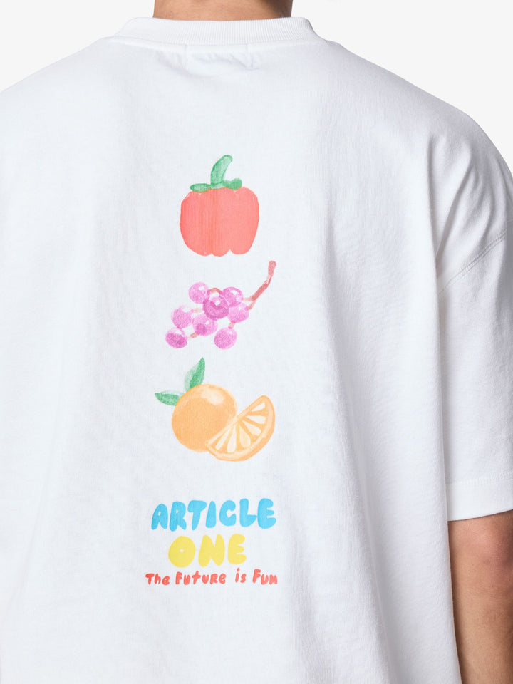 The Salad Tee from Article One is made from cotton jersey and designed with a relaxed fit. It features a small front pineapple print with “Sunny” text and a colorful fruit graphic on the back.