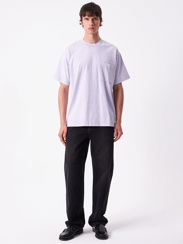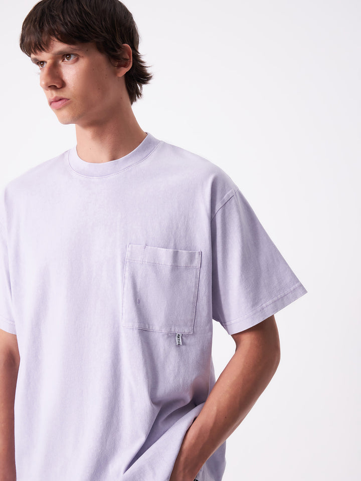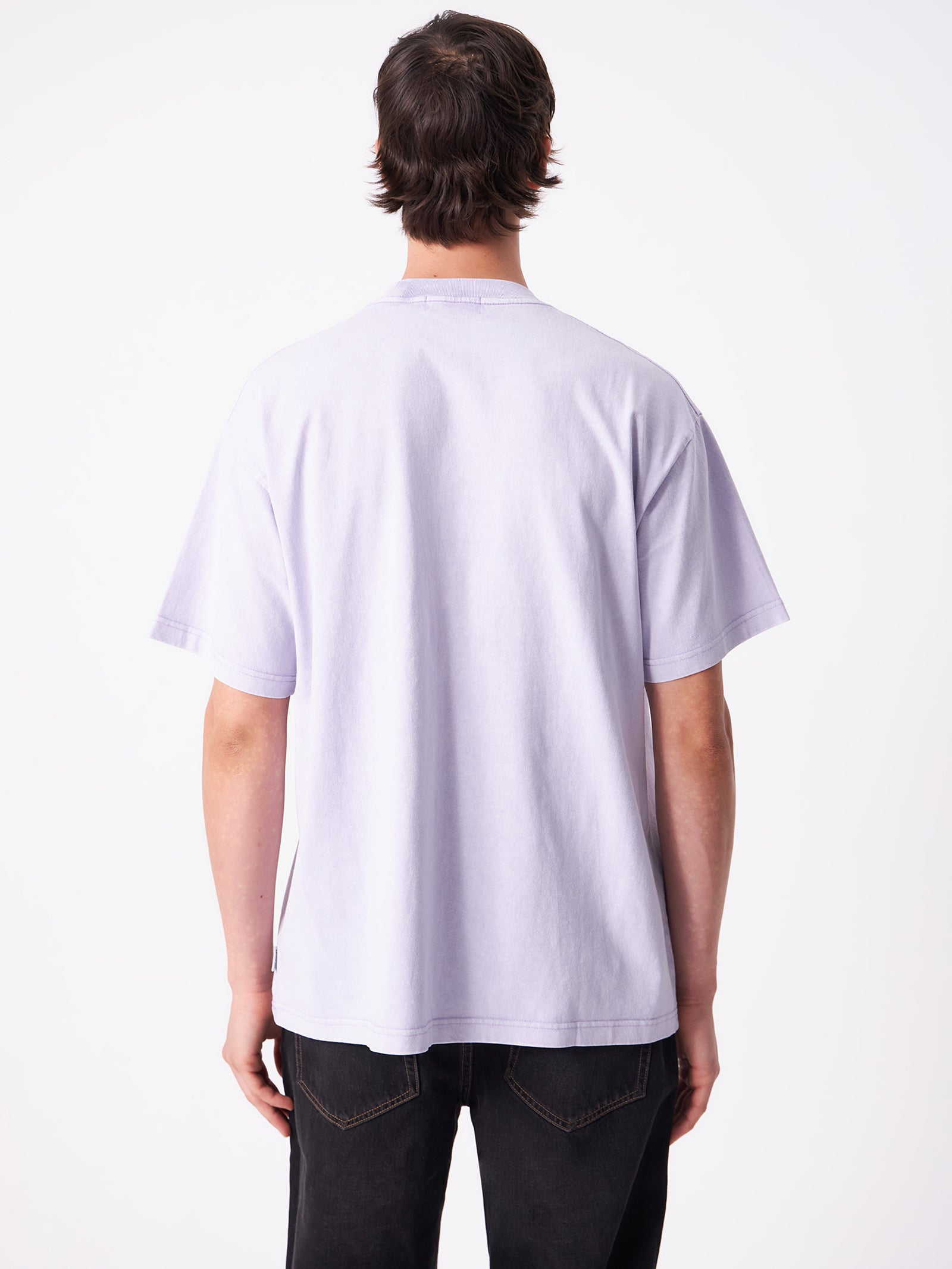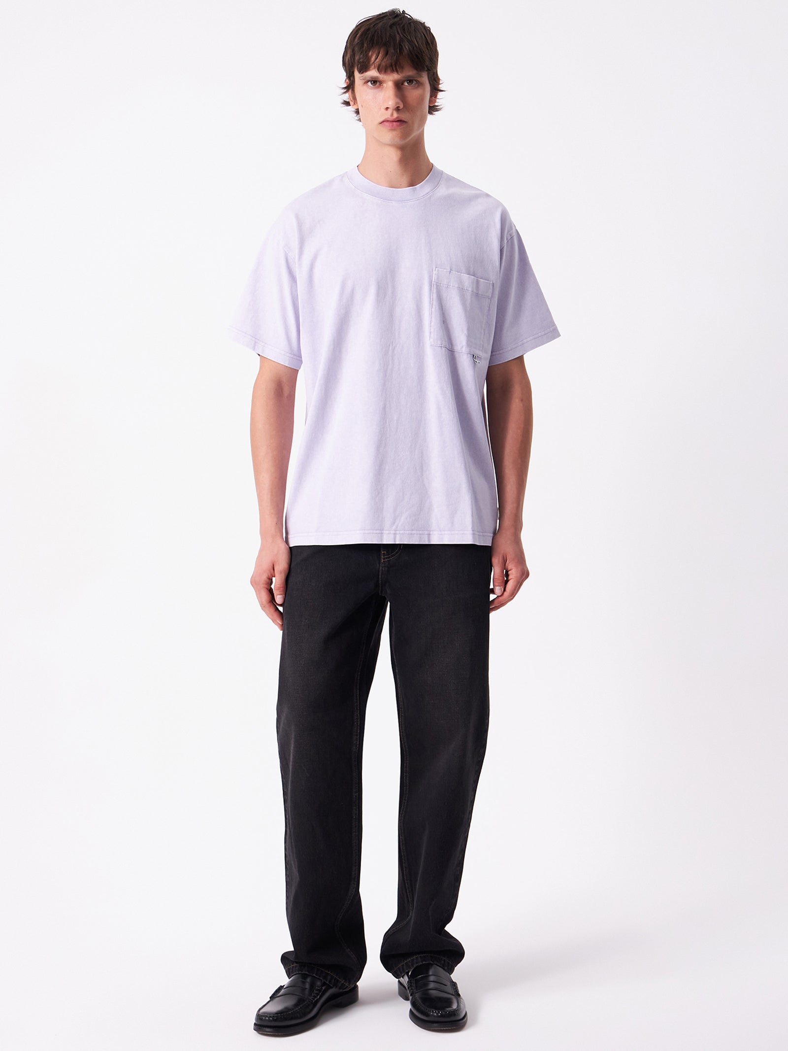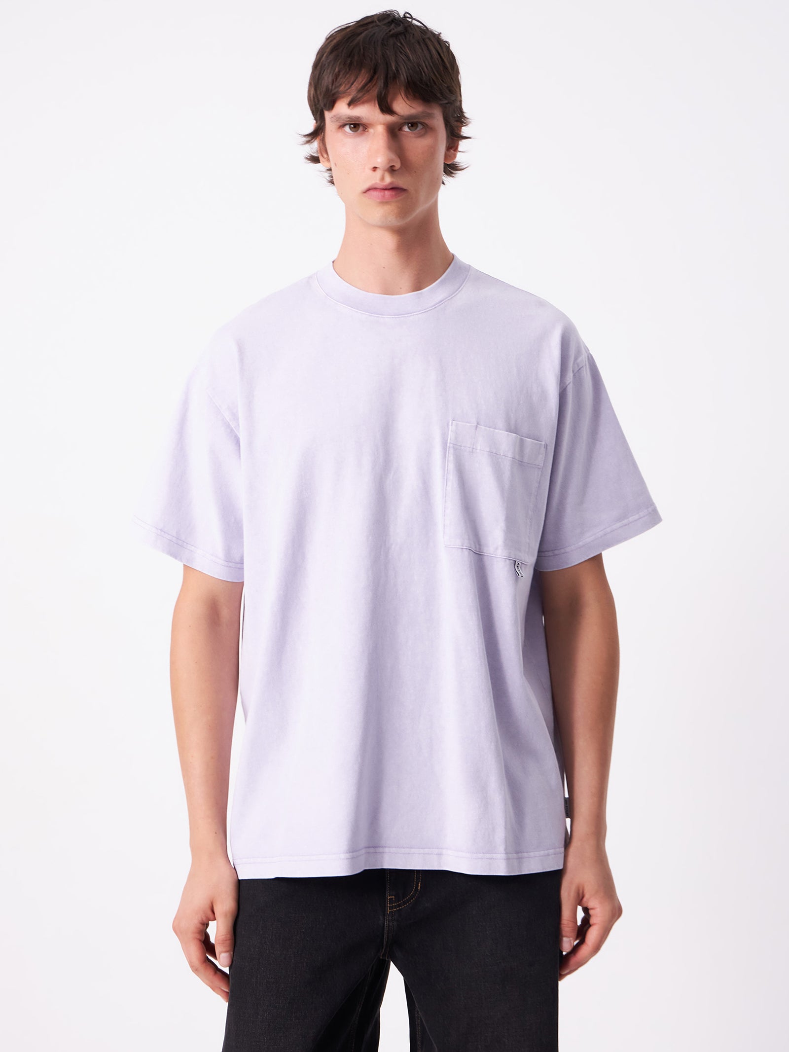 Boxy-cut garment-dye tee, using pigment dye for an uneven, washed dye style.