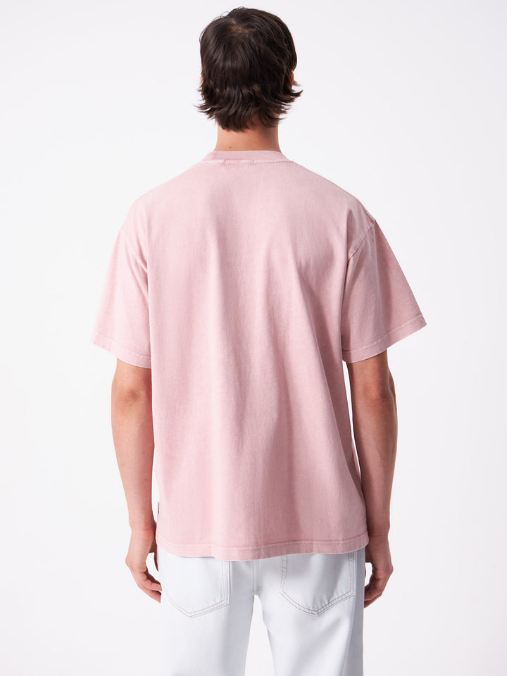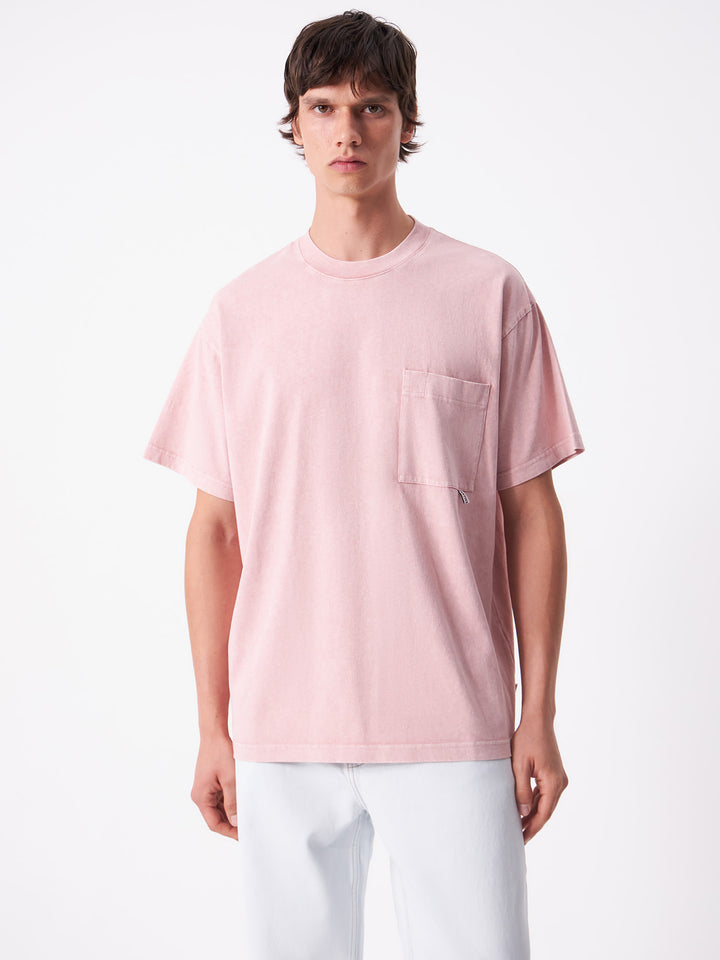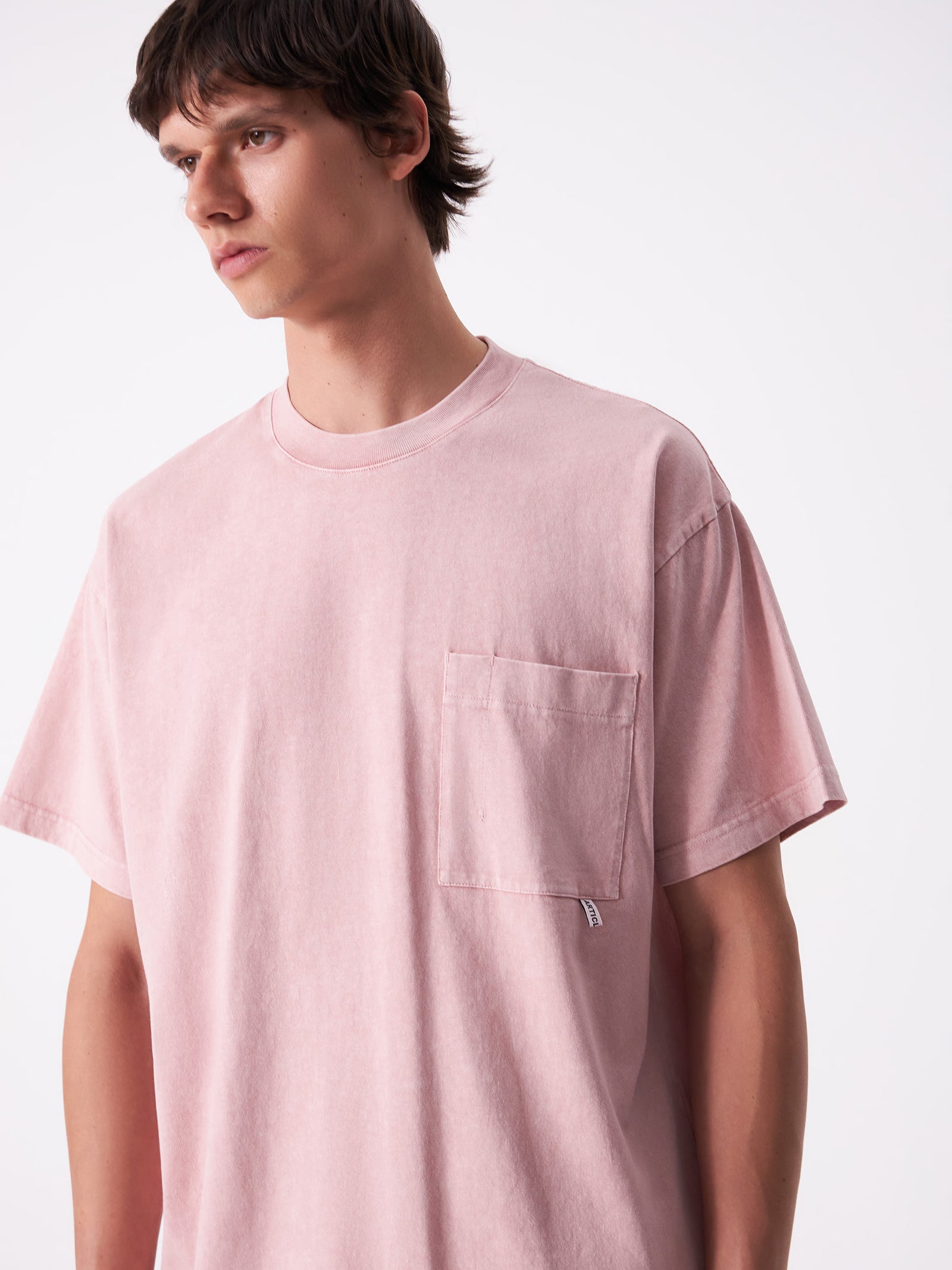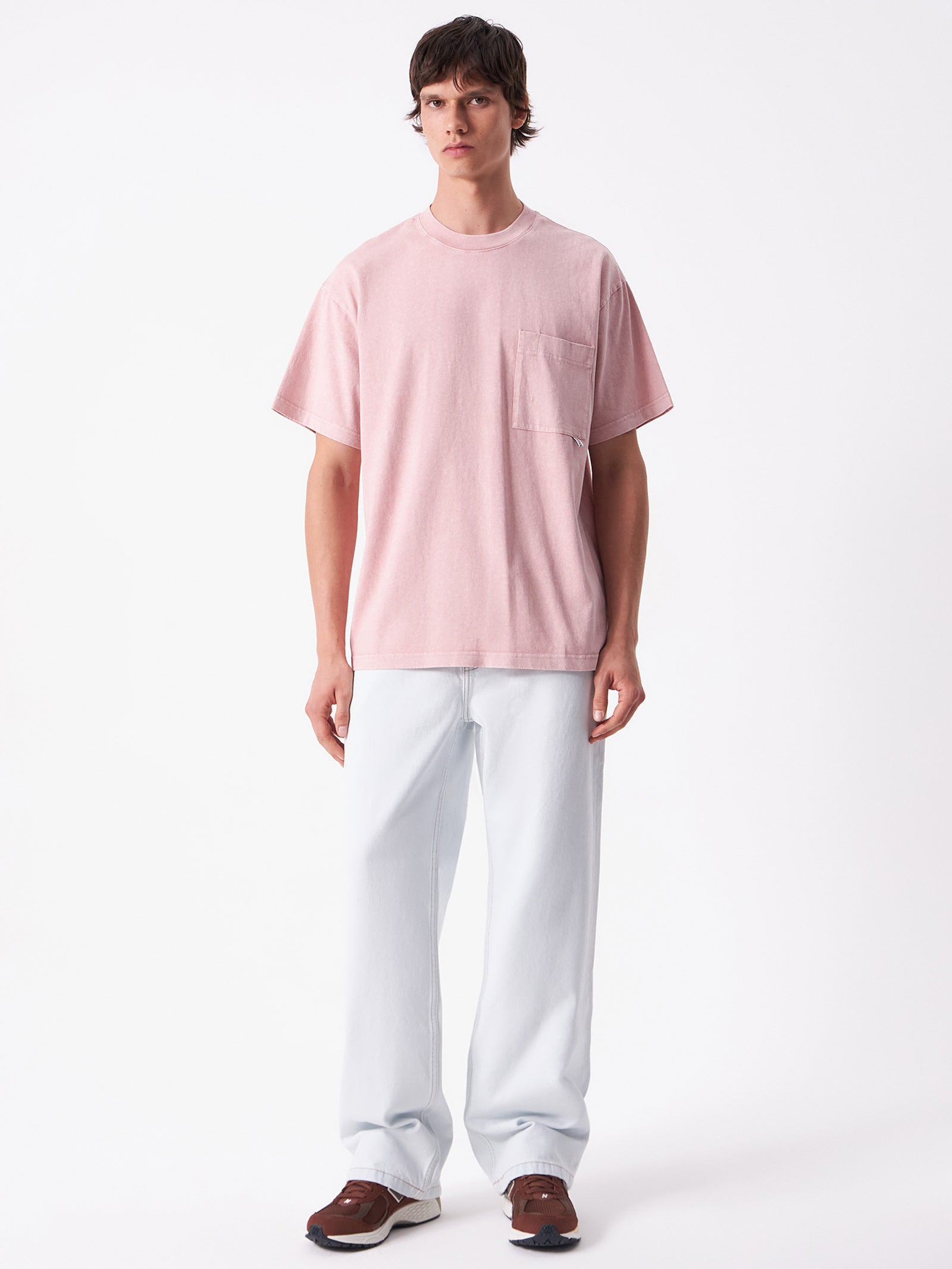 Boxy-cut garment-dye tee, using pigment dye for an uneven, washed dye style.