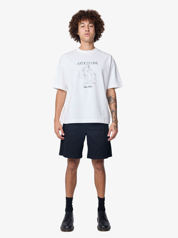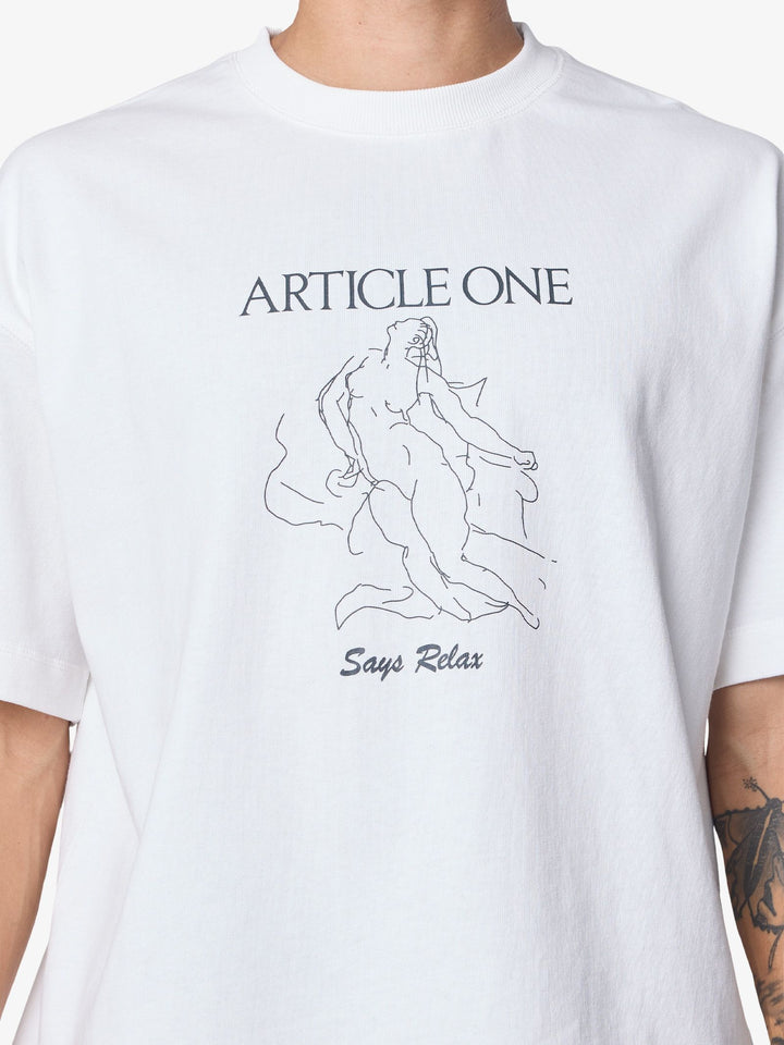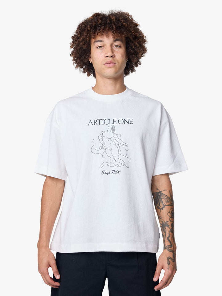 The Says Relax Tee from Article One comes in a relaxed fit crafted from cotton fabric. Designed with a ribbed collar, front graphic, and a clean straight-cut hem.