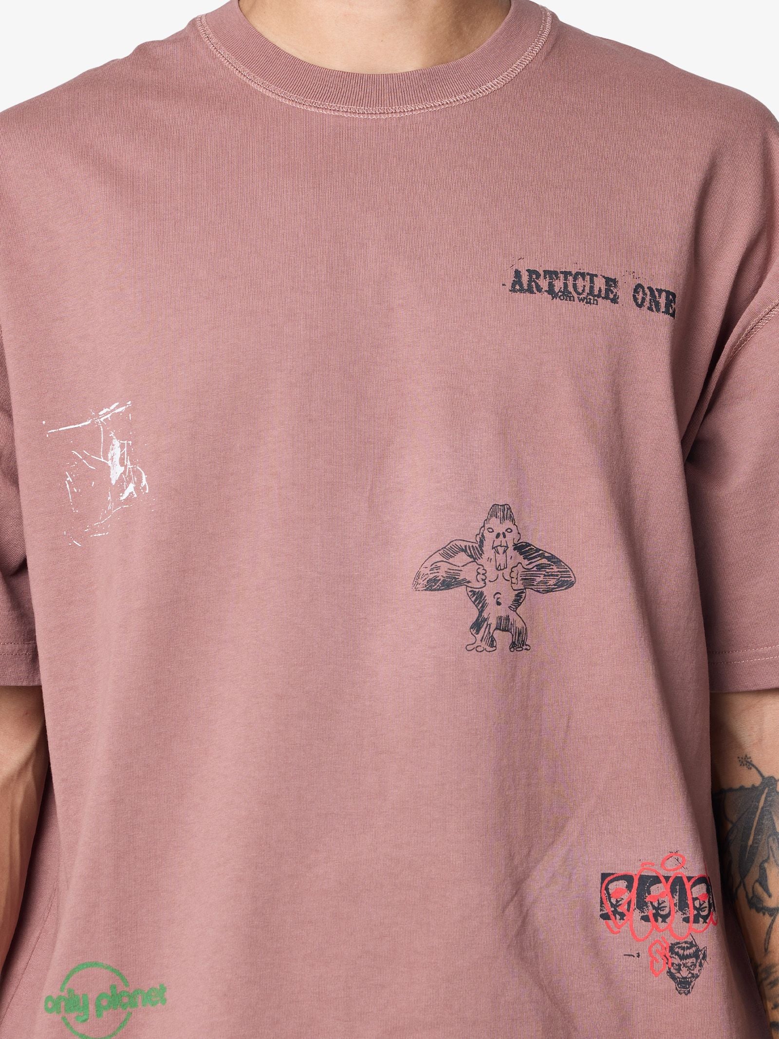 The Wall Tee from Article One has a relaxed boxy shape crafted from cotton fabric. It includes a gorilla graphic, logo text, and multiple front motifs, completed with dropped shoulders, a ribbed collar, and a clean hemline.