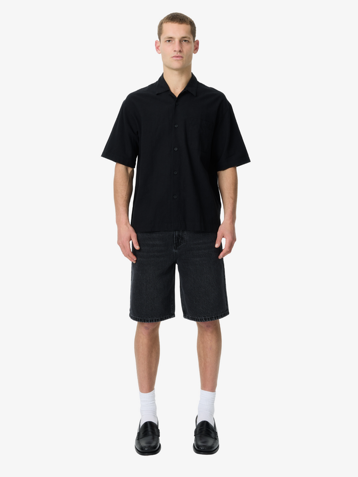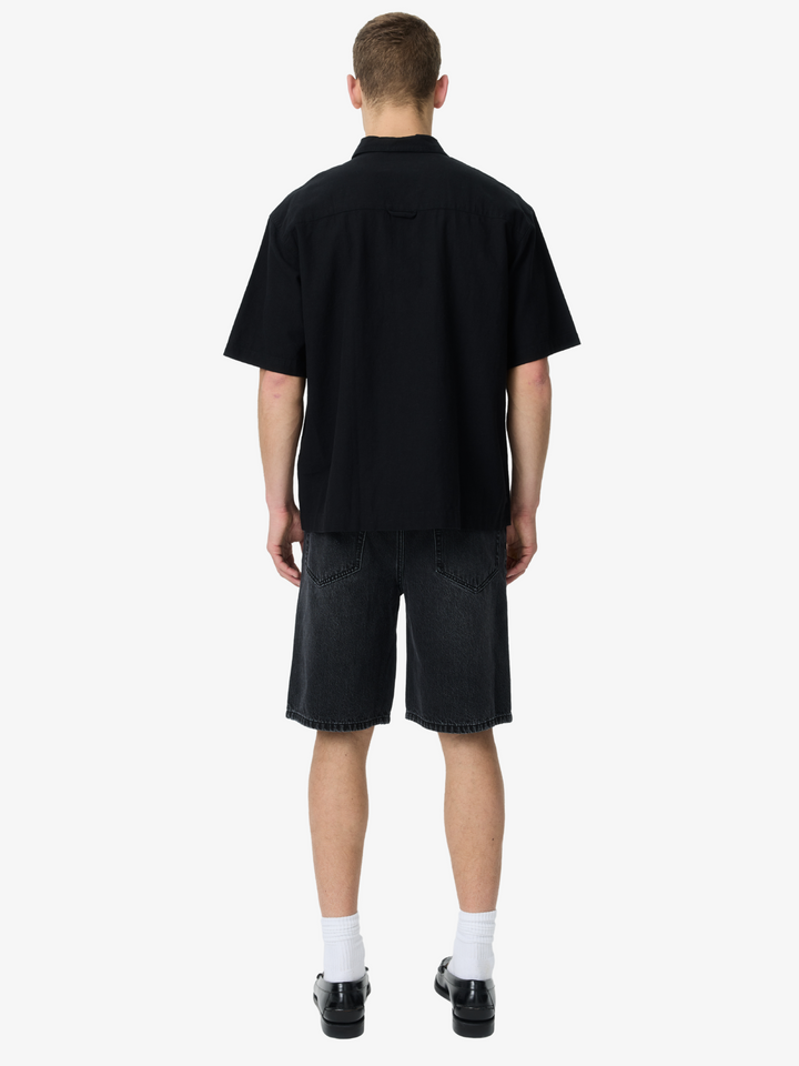 The Whelan Shirt in Black is designed with a relaxed fit and soft drape. This shirt features a clean button front and structured collar.