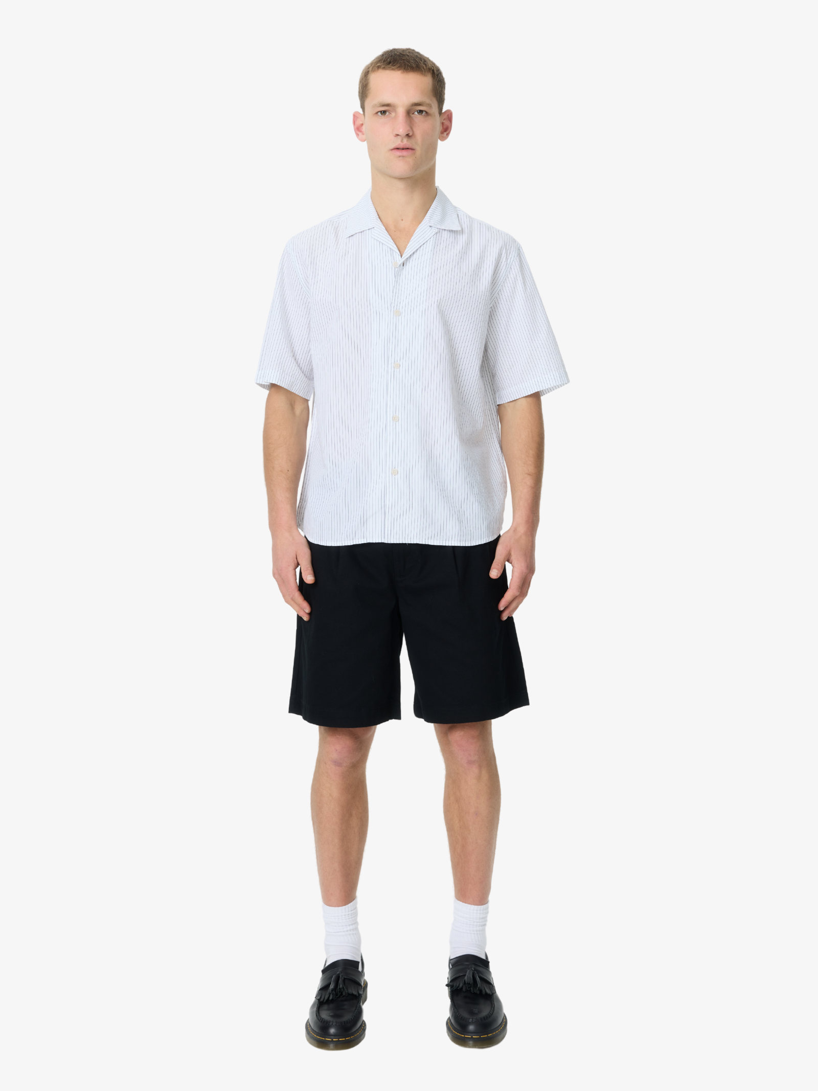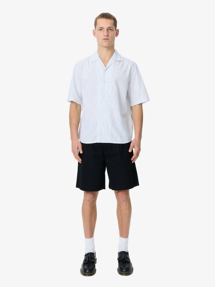 The Wiley Shirt in White Stripe is cut in a relaxed silhouette. This shirt features subtle white pinstripes, structured collar and button-through front.