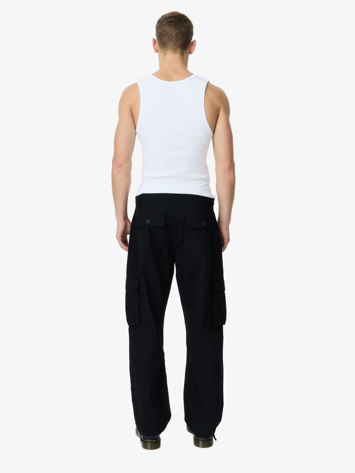 The Wyatt Cargo Pants in Black is designed with a straight-leg fit and features utility pockets, brand patch at back and full-length through leg.