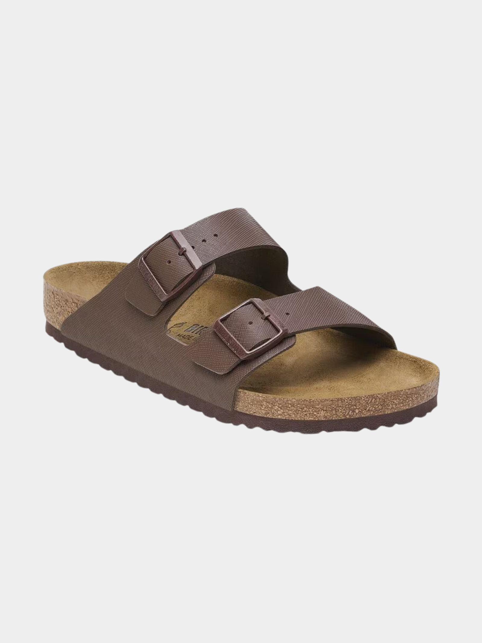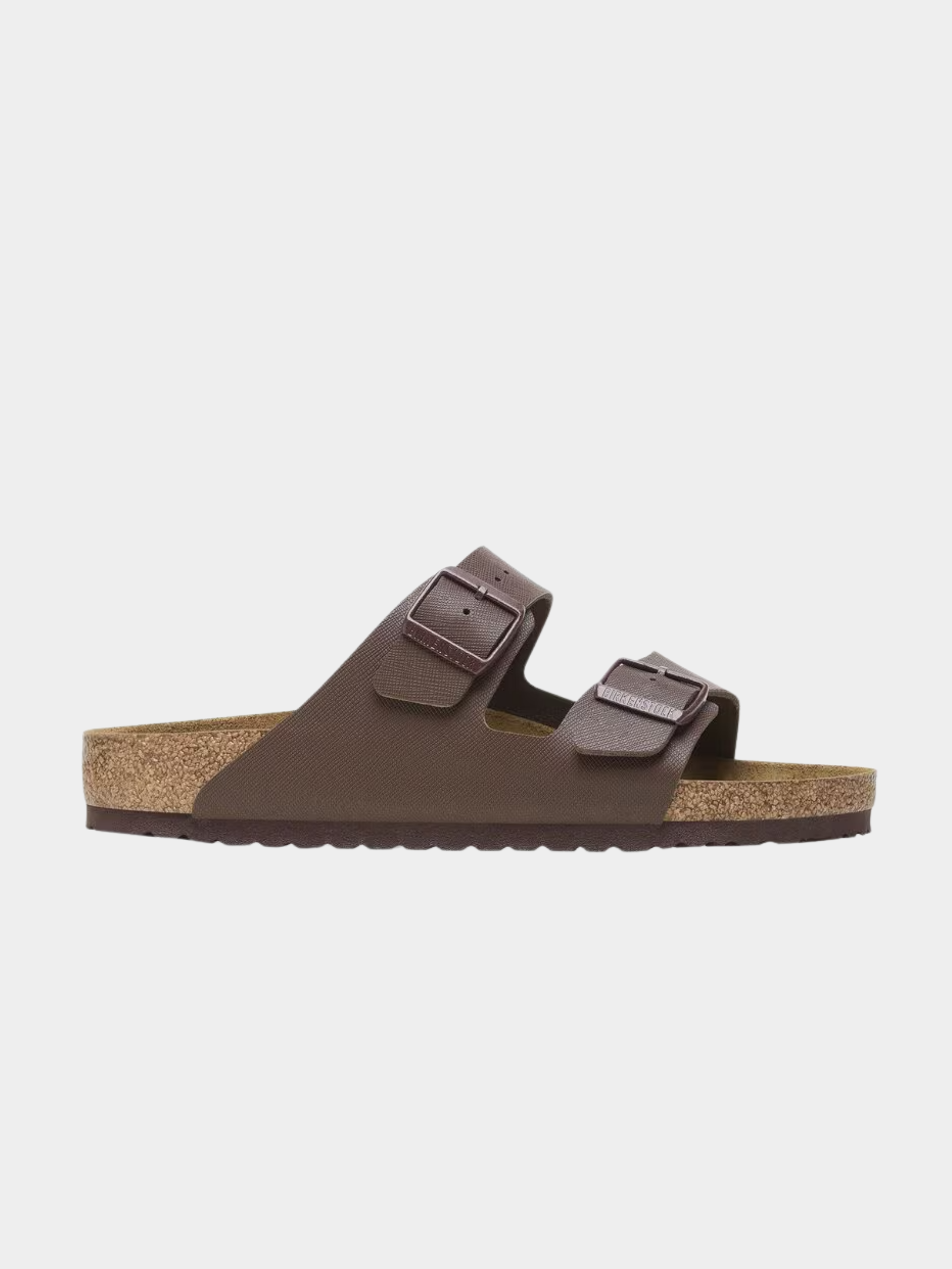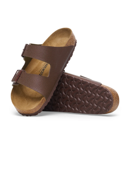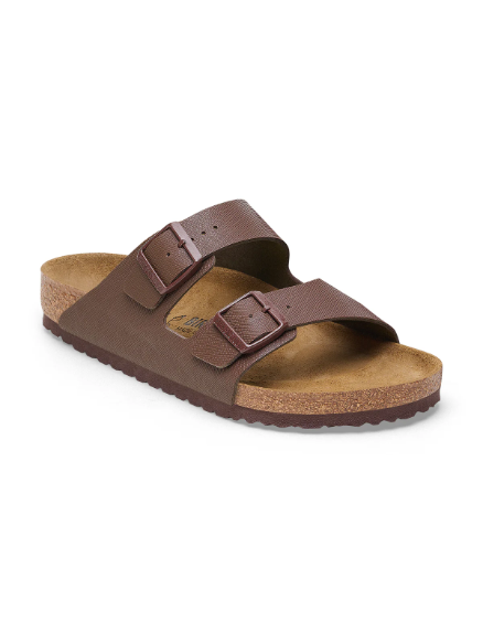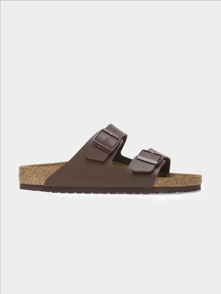 Elevate your everyday style with the Arizona Saffiano Roast Birko-Flor Regular sandal from Birkenstock. This modern update on a classic design combines a sleek, textured finish with premium craftsmanship. Featuring an anatomically shaped cork-latex footbed that molds to your foot, this sandal provides personalized support, complemented by a soft suede lining for added breathability.