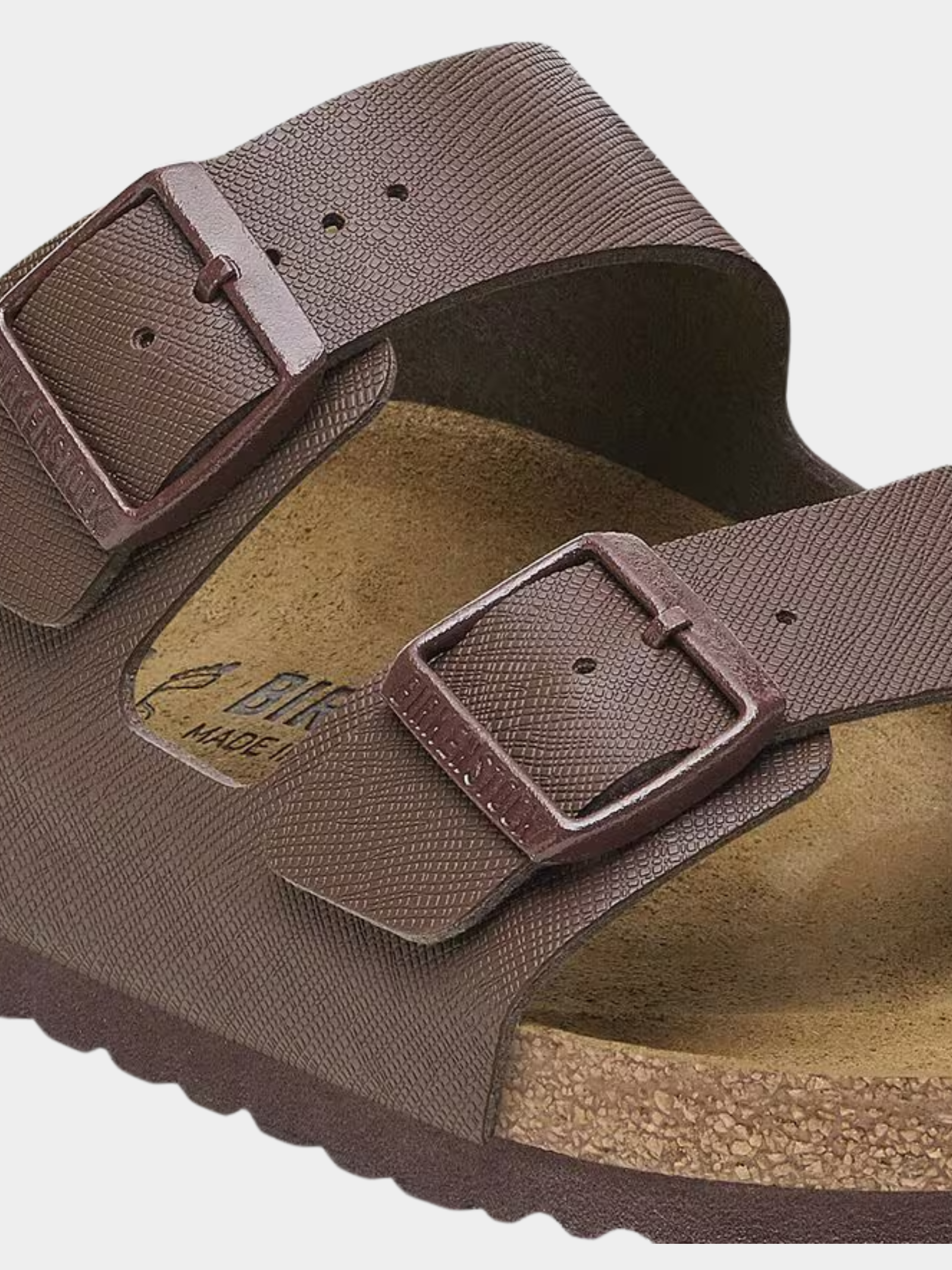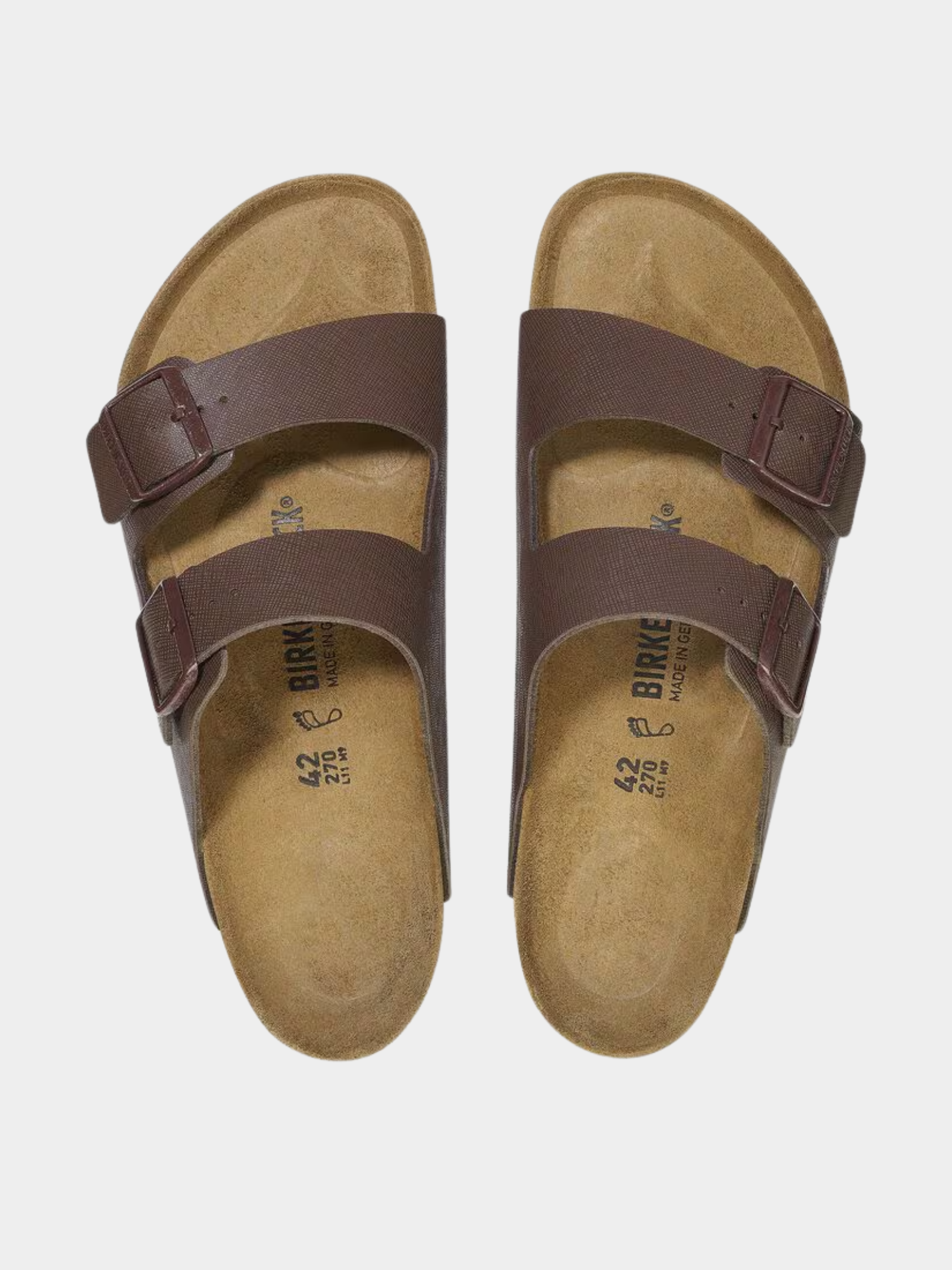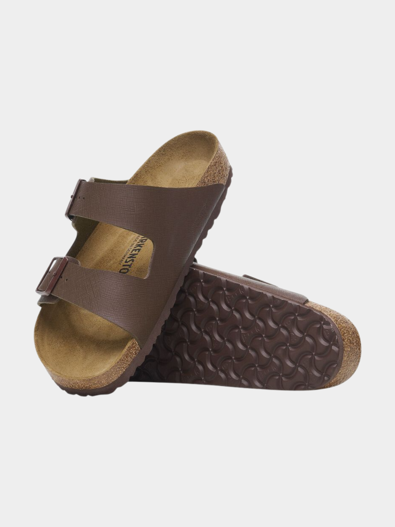 Elevate your everyday style with the Arizona Saffiano Roast Birko-Flor Regular sandal from Birkenstock. This modern update on a classic design combines a sleek, textured finish with premium craftsmanship. Featuring an anatomically shaped cork-latex footbed that molds to your foot, this sandal provides personalized support, complemented by a soft suede lining for added breathability.